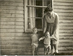 Now to the image. It is one I really wasn’t aware of until many years after mom was gone, dad too. The photo is of mom, Brother Jeff, and myself out back of the house. Mom is holding me up as I am not quite walking yet and Jeff is looking off to the side. Mom is in a skirt and blouse, bobby socks with her hair done up nice. Even though the photograph is in black and white, you can tell the whitewash on the house is faded. The window behind mom is a simple wooden sash that probably kept little of the winter cold from seeping in. It is the kind of picture you could drop in to a Dorothea Lang collection of Dust Bowl photographs and it would not look out of place.